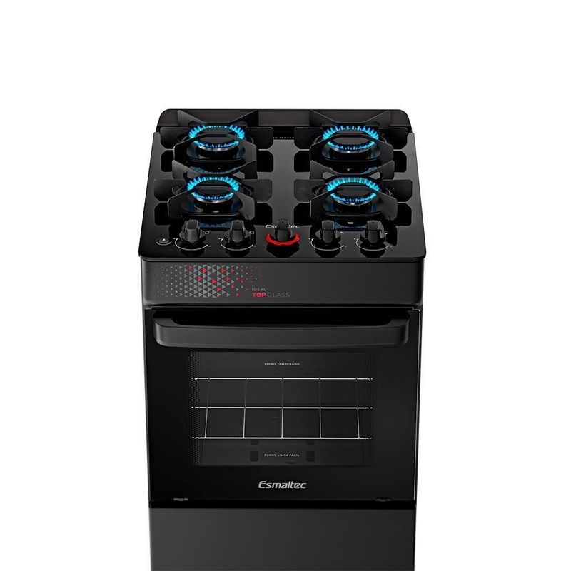 Pés altos e retos com encaixe fácil: mais estabilidade e segurançaDescriçãoO Fogão 4 Bocas Esmaltec Ideal Top Glass a Gás com Mesa de Vidro Preto é perfeito para quem busca um visual moderno aliado à praticidade no dia a dia. A mesa de vidro temperado destaca-se pelo acabamento brilhante, fácil limpeza e excelente resistência.Com acendimento automático, o fogão é mais prático no uso diário. As trempes individuais com 6 apoios oferecem mais firmeza para as panelas, garantindo segurança mesmo em preparos mais intensos.O forno com 50 litros de capacidade, com porta em vidro total, vidro interno removível e prateleira ajustável, permite flexibilidade no preparo de receitas e mais facilidade na higienização.Além disso, o modelo traz puxador ergonômico e pés altos e retos com encaixe fácil, que agregam conforto, estabilidade e funcionalidade no uso cotidiano.O Esmaltec Ideal Top Glass 4 bocas preto a gás é ideal para quem valoriza performance com design sofisticado.Isso é valor. Isso é Esmaltec.Especificações Técnicas:Marca: Esmaltec