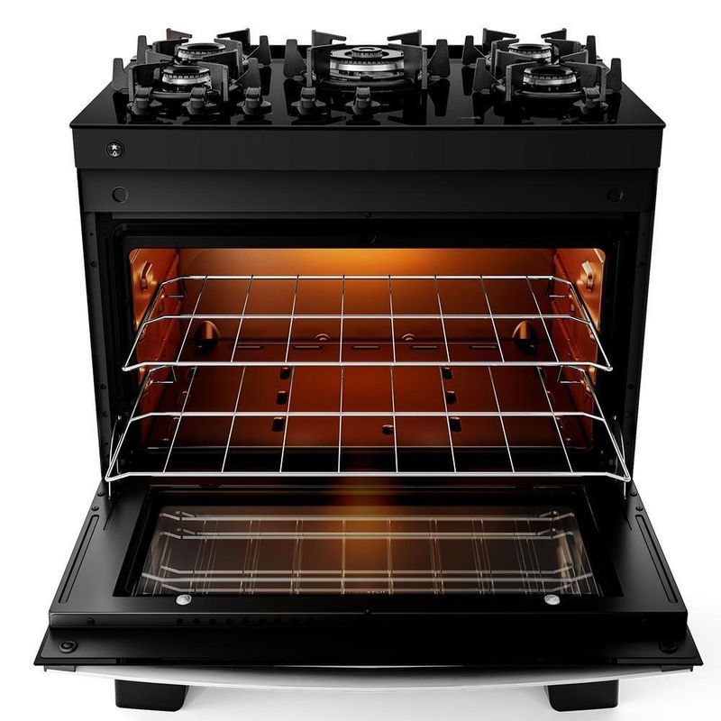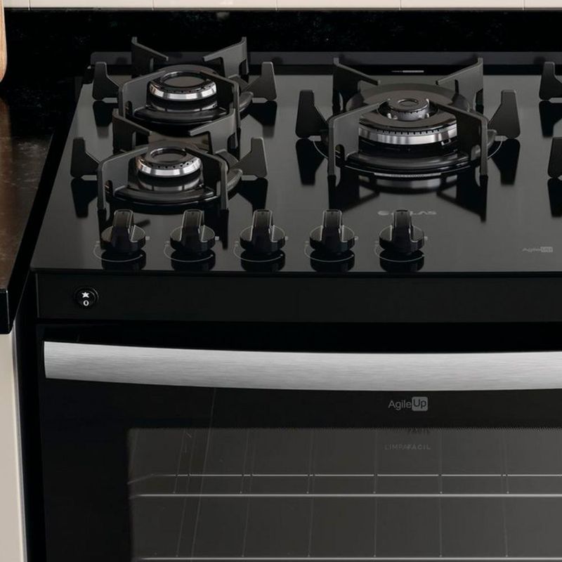 Renove sua cozinha com o Fogão 5 bocas Agile Glass. Produto com design moderno e beleza pra deixar seu dia a dia mais prático. Esse fogão conta com mesa de vidro com grafismo e forno com visor amplo, o que possibilita uma melhor visualização do alimento no momento do preparo. Por falar em forno, esse fogão 5 bocas mesa de vidro tem um espetacular. Ele tem capacidade para preparar até 86,5 litros, 2 prateleiras deslizantes e ainda conta com acabamento em esmalte limpa fácil. Tudo isso para deliciar família toda com as melhores receitas. Suas grades em ferro fundido contam com 6 pontos de apoio, trazendo maior durabilidade e resistência as altas temperaturas, além de manter a estabilidade dos utensílios. Esse fogão atlas conta ainda com controle de temperatura simples e ágil, puxador ergonômico com acabamento em alumínio escovado e pés altos e robusto. NA