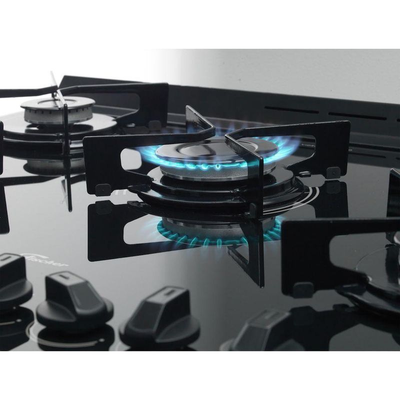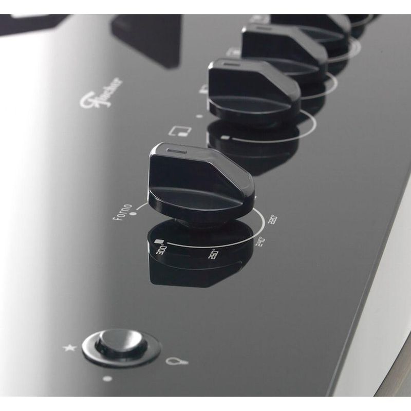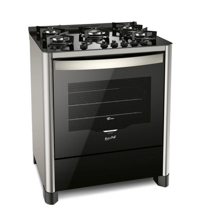Fogão De Piso Fischer 5Q Gran Cheff Gás BivoltFogão de Piso Fischer 5Q Gran Cheff GásO Fogão de Piso Fischer 5Q Gran Cheff Gás oferece versatilidade, permitindo assar, tostar, gratinar e aquecer com eficiência. Possui lâmpada interna que facilita a visualização dos assados, com proteção de vidro. O controle de temperatura do forno varia de 190°C a 300°C e a porta tem abertura ergonômica para maior praticidade. Conta com acendimento automático total, seguro e sem riscos de queimadura, bastando pressionar e girar o manipulador.Os queimadores são equipados com tecnologia italiana de alta eficiência e durabilidade. A mesa de vidro temperado preta e o suporte das trempes esmaltado em Easy Clean preto trazem um design moderno e funcional. As trempes possuem novo design e melhor encaixe para as panelas, enquanto os manipuladores (botões) são removíveis e na cor preta. O fogão dispõe de 5 queimadores: 1 queimador rápido (3000W) e 4 queimadores semirrápidos (1830W). O forno é equipado com 1 queimador de 3300W.O fogão também conta com puxador em alumínio escovado anodizado, laterais em aço pintado silver e porta com vidro duplo serigrafado, proporcionando um amplo visor. O perfil frontal é pré-pintado silver e os pés garantem maior estabilidade ao produto. Acompanha 2 grades cromadas, ajustáveis, deslizantes e removíveis, além de bandeja esmaltada para resíduos, removível. O corpo interno do forno é revestido com Easy Clean, facilitando a limpeza. O sistema de segurança inclui válvula corta-gás e o fogão sai de fábrica ajustado para GLP, com conversão para gás natural (GN) sendo gratuita (vide manual de instruções).Especificações TécnicasMarca: Fischer