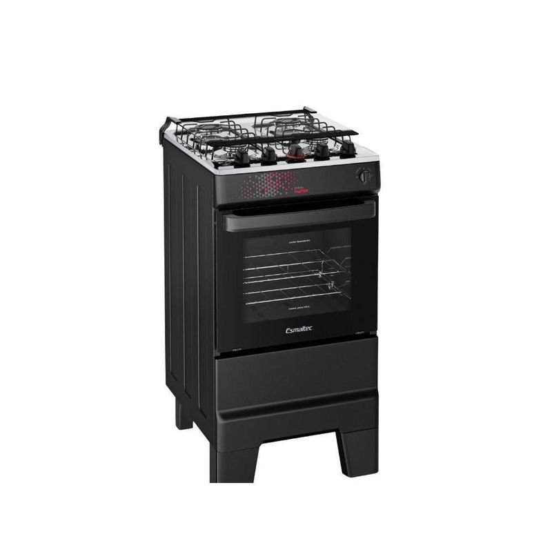 Fogão Esmaltec 4 Bocas Ideal Master Mesa Inox Tampa de Vidro Forno 50 Litros Preto T4ITP BivoltMesa de aço inox com tampão de vidro e acendimento automático.