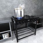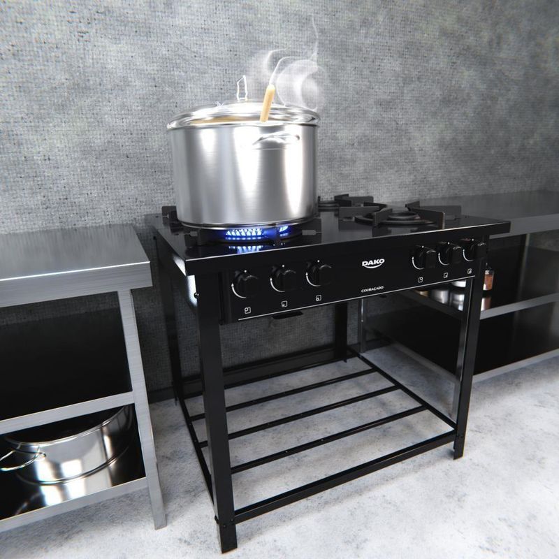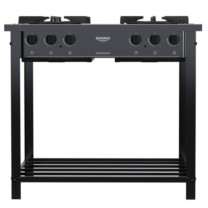 Fogão Industrial 4 Bocas Preto Com Tripla Chama Dako Couraçado Fogão Industrial 4 Bocas Preto com Tripla Chama Dako Couraçado: Tradição e versatilidade O novo fogão industrial Dako Couraçado conta com mesa em aço esmaltado com revestimento Limpa Fácil; ignição manual; 4 queimadores, sendo 2 frontais com Tripla Chama de 5,2kW e duplo controle e 2 traseiros com Dupla Chama de 4,2kW; grades extra largas e robustas de ferro fundido com 6 pontos de apoio, que suportam grandes panelas; bandeja coletora de resíduos e base em treliça para armazenamento e suporte.
