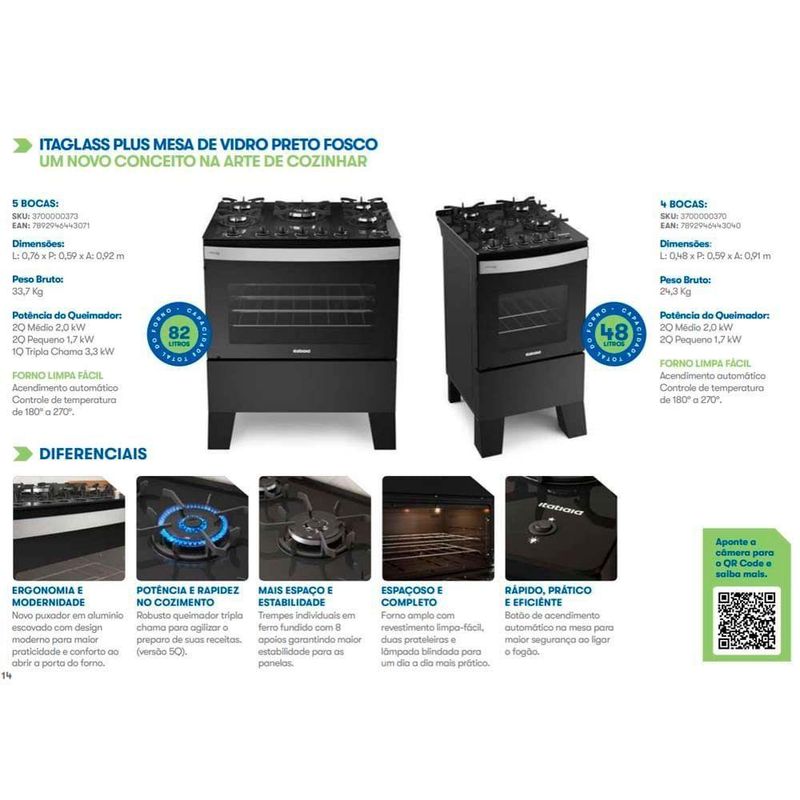 Fogão Itaglass Plus 4 Bocas - PretoDescriçãoO Fogão Itaglass Plus 4 Bocas é o eletrodoméstico que vai revolucionar a sua experiência na cozinha. Com um design moderno e funcional, este fogão é ágil no preparo de receitas, proporcionando praticidade e eficiência no seu dia a dia. Seu amplo forno e diversos recursos tornam a culinária mais prazerosa e descomplicada.Características PrincipaisNovo puxador em alumínio escovado para maior conforto ao abrir a porta do forno.Acendimento automático para facilidade no uso.Luz de forno blindada, garantindo segurança durante o preparo dos alimentos.Manípulos removíveis para uma limpeza mais prática.AtributosO Fogão Itaglass Plus 4 Bocas é a escolha ideal para cozinhas compactas que necessitam de um eletrodoméstico que se adapte ao espaço disponível. Além disso, sua durabilidade e resistência garantem um investimento de qualidade para o seu lar.Adquira hoje mesmo o seu Fogão Itaglass Plus 4 Bocas e transforme a sua rotina na cozinha!