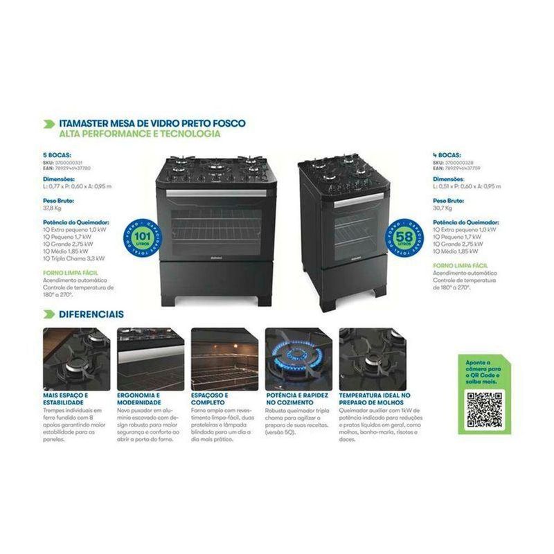 Fogão Itamaster 4 Bocas Preto Bivolt Design moderno e tecnológico para facilitar sua vida na cozinha