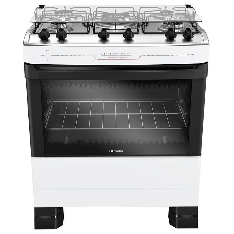 Fogão Mueller 5 Bocas Branco Com Tripla Chama MFI5BFNovo fogão 5 bocas com queimador Tripla Chama. Mais rápido para cozinhar, mais tempo para saborear.Com o novo fogão Mueller 5 bocas branco com mesa de inox MFI5BF, cozinhar fica mais rápido e prático. A potência do queimador central Tripla Chama garante chamas fortes para receitas prontas em instantes, proporcionando mais tempo para saborear cada momento na sua cozinha. Quem valoriza tradição, qualidade e agilidade não precisa perder tempo procurando o fogão ideal. Escolha Mueller.INFORMAÇÕES TÉCNICASAltura (cm): 93,5 cmLargura (cm): 75 cmProfundidade (cm): 58 cmDimensões internas do forno: A: 30,5 x L: 64 x P: 41 cmPeso (kg): 26,4 kgBocas: 5Garantia: 12 mesesTipo do Fogão: A Gás, de PisoMesa: Aço Inox