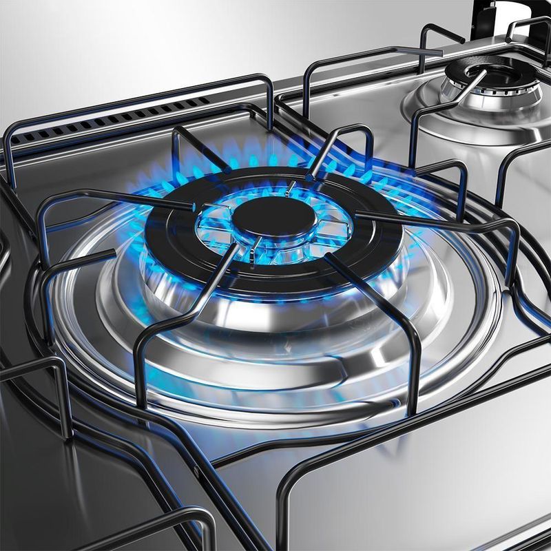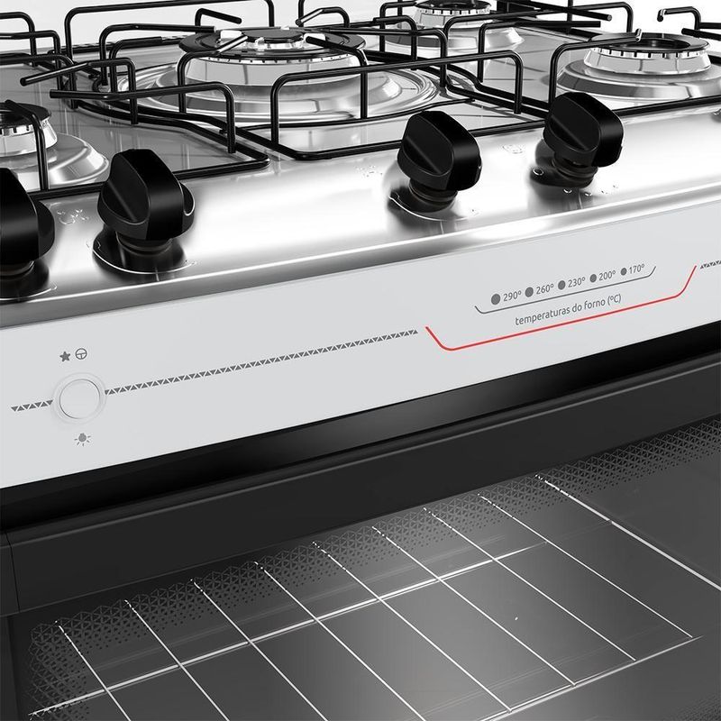 Queimador Tripla Chama: 3.700 Watts de potênciaQueimador família: 2.000 Watts de potênciaQueimador médio: 1.700 Watts de potênciaPotência do queimador do forno (watts): 3.000 Watts de potênciaLuz no interior do Forno: SIMAcabamento do interior do forno: Total CleanPorta do Forno: Duplo vidro com proteção térmicaPrateleiras do forno: Possui uma grade ajustável em dois níveis de alturaCapacidade do Forno: 81,6 LTipo de gás: GLP (Conversível para GN)Tensão: BivoltClassificação Eficiência Energética: A