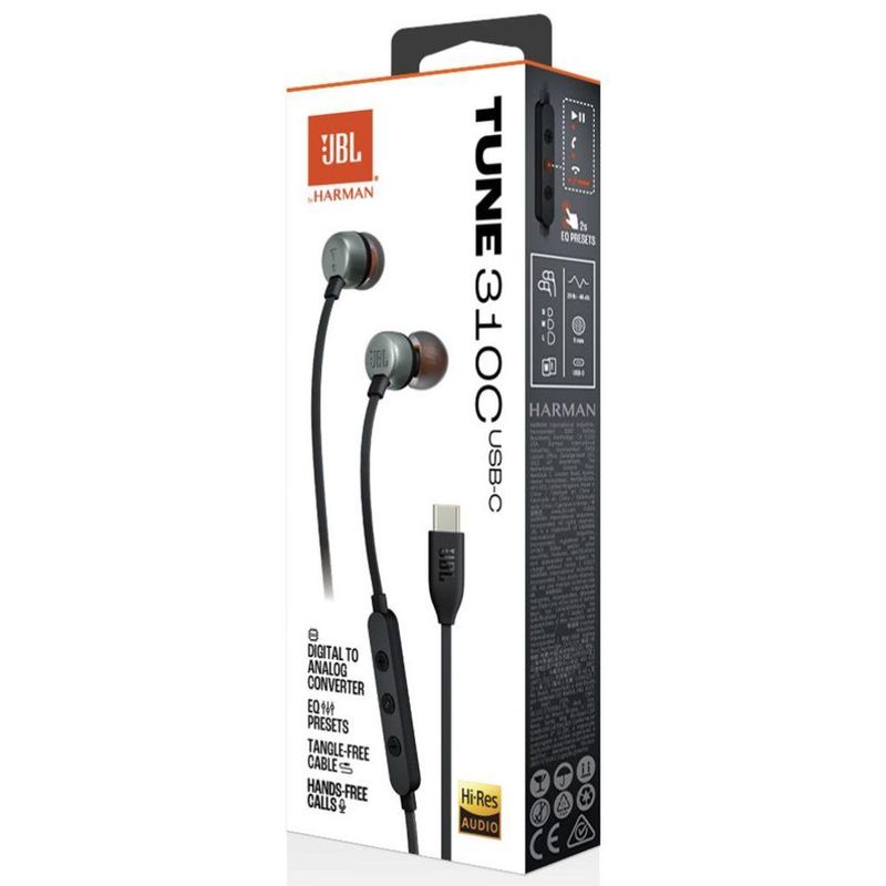 Caracteristicas: - Marca: JBL - Modelo: JBLT310CBLK Áudio de alta resolução com som JBL Pure Bass. Disponível agora. Apresentamos os fones de ouvido intra-auriculares JBL Tune 310C USB-C. São leves, confortáveis e compactos. Um par de drivers dinâmicos de 9 mm produz um som JBL Pure Bass poderoso, enquanto o suporte de áudio de alta resolução garante excelente qualidade de som. A conexão USB-C os torna compatíveis com uma variedade de dispositivos, como PCs, telefones celulares e dispositivos de jogos. Além disso, um controle remoto de três botões em um cabo plano que não emaranha permite controlar a reprodução de música e ajustes de volume, predefinições de equalização e atender chamadas rapidamente usando o microfone integrado. Tudo isso faz do JBL Tune 310C USB-C seu companheiro diário no trabalho, em casa e na estrada. Especificações Técnicas: - Resposta de frequência 20 Hz a 40 kHz - Impedância 16 ohm - Sensibilidade 98 dB SPL a 1 kHz 1 mW Sensibilidade do microfone -42 dBV/Pa a 1 kHz - Temperatura máxima de operação 45 °C Conteúdo da embalagem: - 1 fone de ouvido JBL Tune 310C USB-C - 3 tamanhos de ponteiras auriculares - 1 garantia/advertência (W/!) - 1 guia de início rápido/ficha de segurança do produto (S/i) Dimensões: - 15 x 7 x 4 cm - Peso 14,3g Garantia: 1 ano