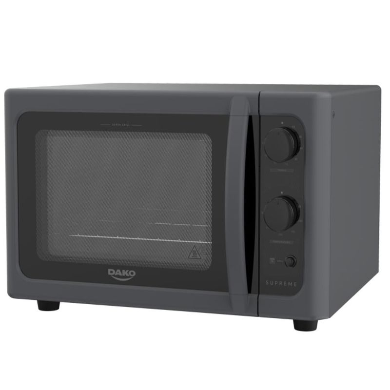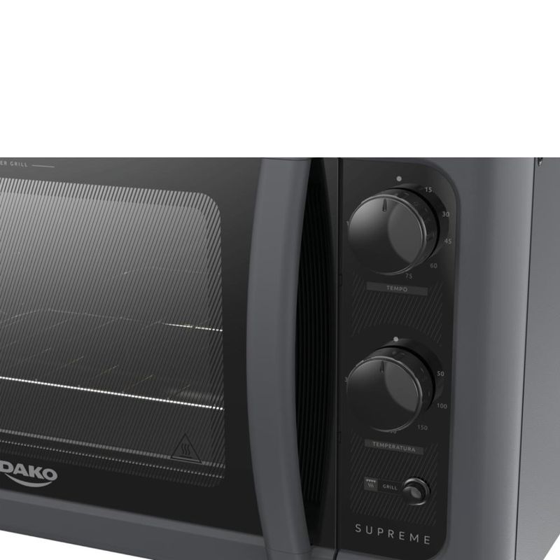 O Forno de Bancada Dako Supreme, além da beleza traz praticidade e agilidade à cozinha. Possui perfeita potência de 1750W e porta com vidro duplo temperado que pode manter por mais tempo o calor interno, reduzindo o consumo de energia elétrica. Possui pés antiderrapantes que oferecem mais estabilidade e segurança e conta ainda com termostato automático de 50ºC a 300ºC, sem esquecer do timer de até 120 minutos com aviso sonoro