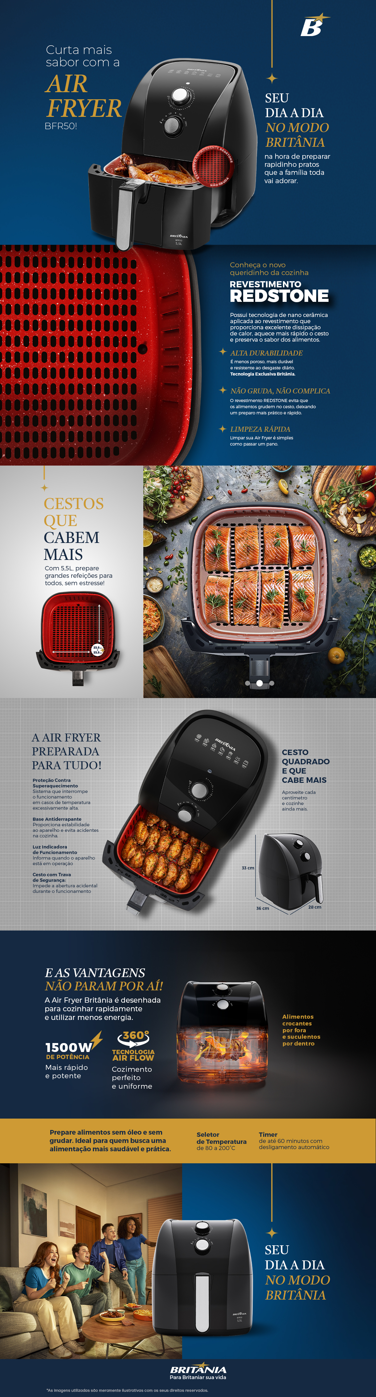 Desfrute de refeições deliciosas e saudáveis com a Air Fryer Britânia 5,5L Redstone BFR50 — a praticidade e o sabor que você merece no seu dia a dia!