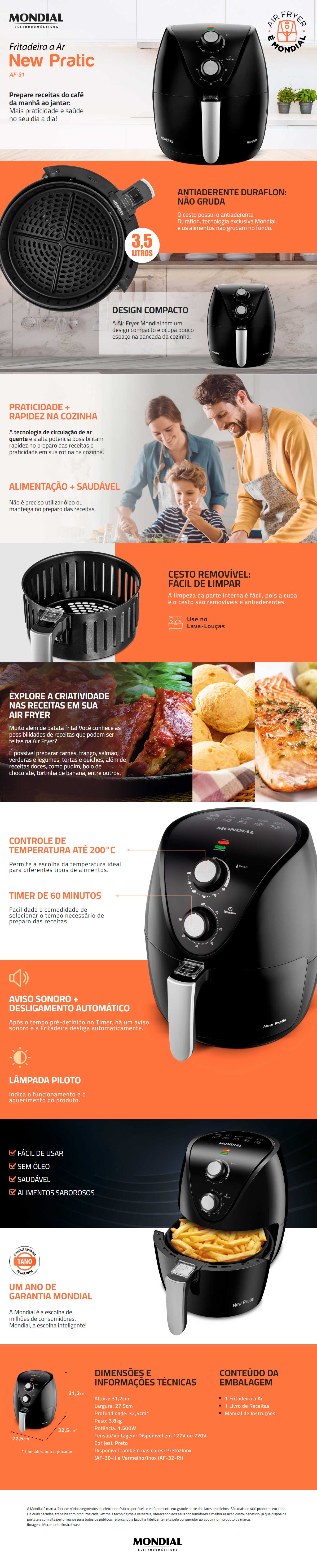 Transforme sua rotina na cozinha com a Air Fryer Mondial AF-31, que alia praticidade, saúde e sabor em um só aparelho. Ideal para preparar refeições deliciosas e saudáveis com rapidez e eficiência!