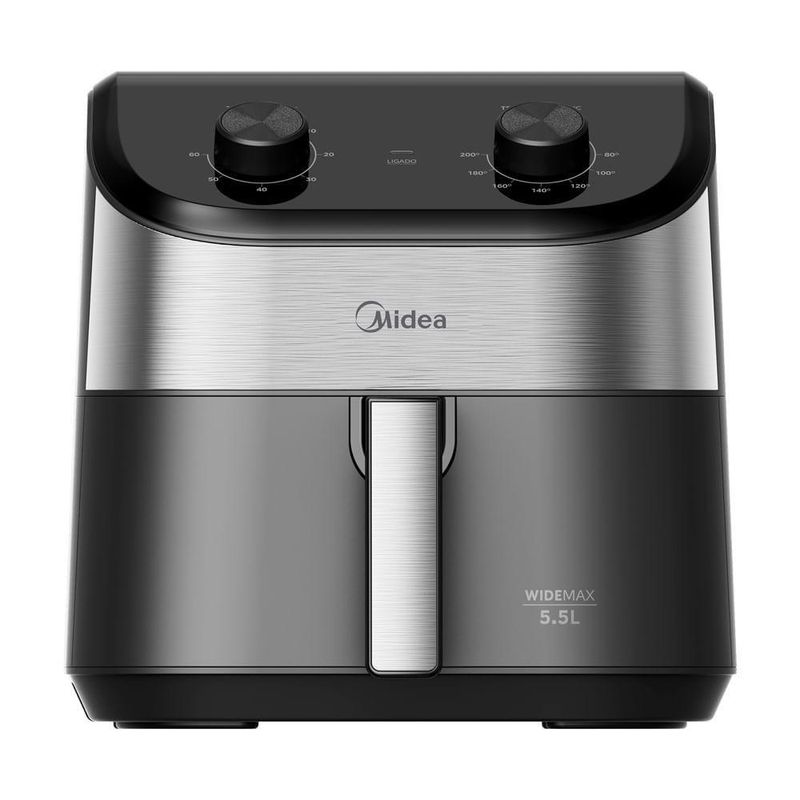 Fritadeira Air Fryer Midea Widemax Preto E Inox 5,5L 110V FWM55P1A Fritadeira Air Fryer Wide Max 5,5L Midea é ideal para preparar receitas deliciosas e saudáveis com praticidade. O Revestimento Antiaderente BlackStone evita que os alimentos grudem, tornando a limpeza uma tarefa fácil.A fritadeira conta com sensor de desligamento automático, que interrompe o funcionamento ao retirar a bandeja, garantindo mais segurança.Com 1.900W de potência, a fritadeira oferece aquecimento rápido e eficiente. Ela ainda permite maior precisão no preparo das suas receitas, com timer de 60 minutos e temperatura ajustável até 200°C.