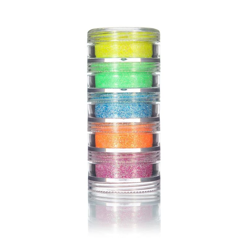 Kit Completo: 5 cores de glitter em pó, permitindo a mistura de tons e efeitos personalizados.