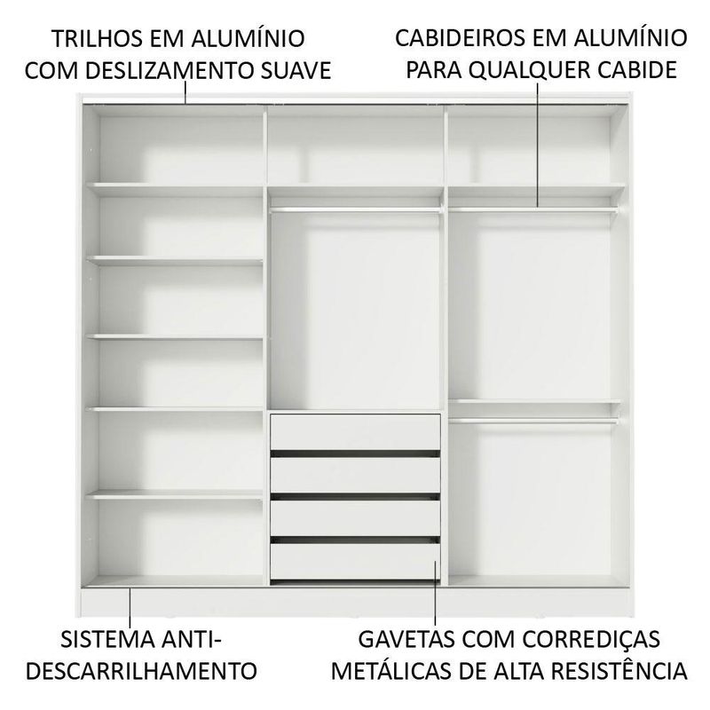 Conta com ótima distribuição interna, incluindo quatro gavetas espaçosas e com corrediças metálicas. Ideal para utilização no quarto de casal, o móvel possui abertura com três portas de correr com deslizamento suave, que facilitam a circulação no ambiente.