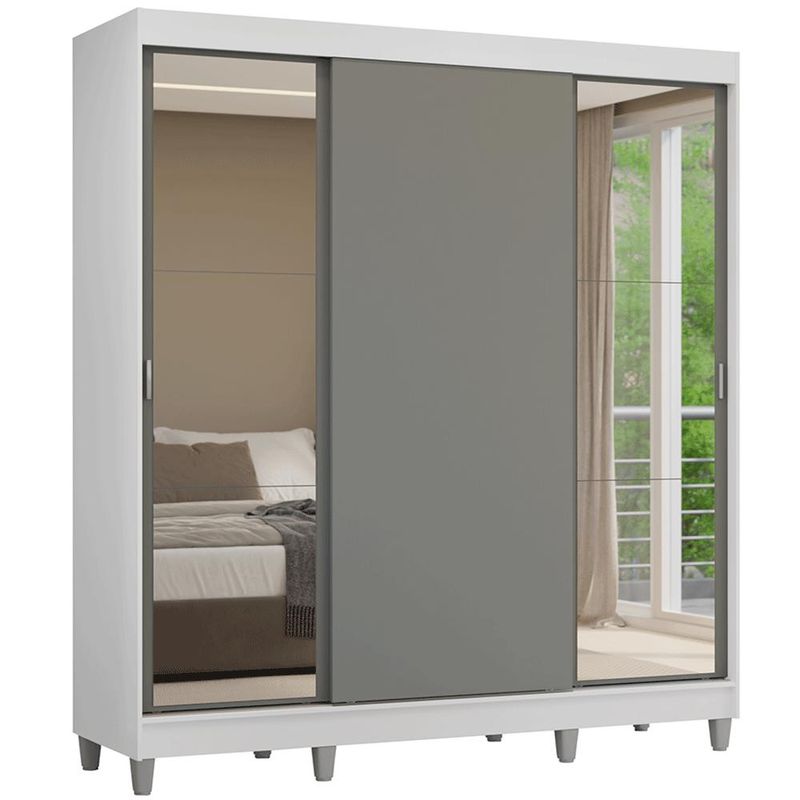 O acabamento da estrutura é Branco e das portas em Cinza, combinando resistência e elegância. Com design pensado para unir beleza e funcionalidade, o Guarda-Roupa Reno com pés é perfeito para transformar o seu quarto em um ambiente moderno e organizado.