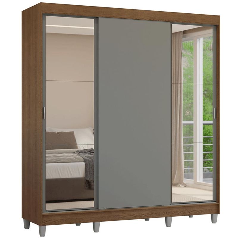 Essa versão possui três portas de correr, sendo duas com espelhos, que trazem mais praticidade no dia a dia. Os trilhos de alumínio garantem deslizamento suave e silencioso, otimizando o espaço do quarto. Por dentro, o guarda-roupa oferece quatro gavetas espaçosas com corrediças metálicas e três cabideiros, proporcionando espaço ideal para roupas, acessórios, malas e outros itens, mantendo tudo sempre organizado.