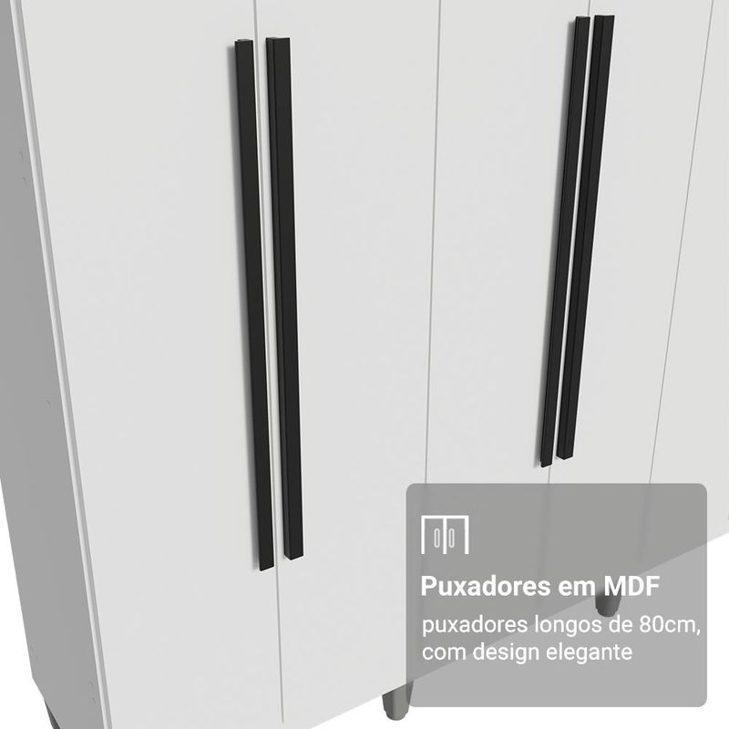Com acabamento de alta resistência, o Guarda-Roupa Saturno oferece durabilidade por muito mais tempo. A estrutura branca e os puxadores em Preto criam um visual sofisticado que se adapta a qualquer estilo de decoração. Os puxadores de 80 cm, fabricados em MDF, são um dos grandes diferenciais, trazendo um design alongado e moderno. Os pés adicionam elegância e facilitam a limpeza, elevando o design do móvel.