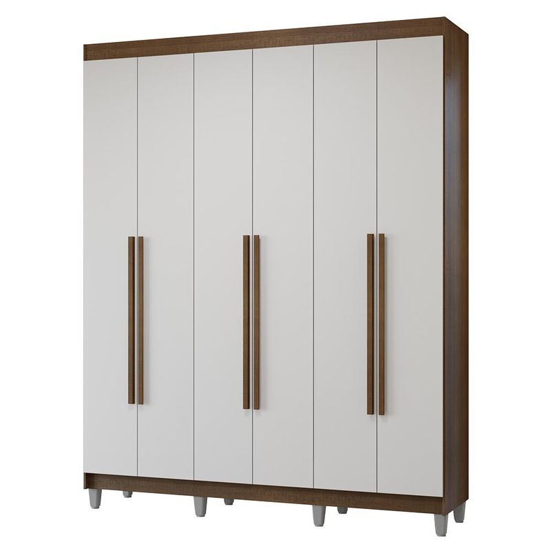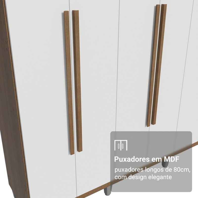 Com acabamento de alta resistência, o móvel garante durabilidade e acabamento impecável. A estrutura e os puxadores em tom amadeirado Rustic, combinados com as portas brancas, criam um visual elegante e moderno. Os puxadores de 80 cm, fabricados em MDF, são um diferencial que destaca o design alongado do móvel. Os pés elevam o guarda-roupa, conferindo estilo e facilitando a limpeza do ambiente.