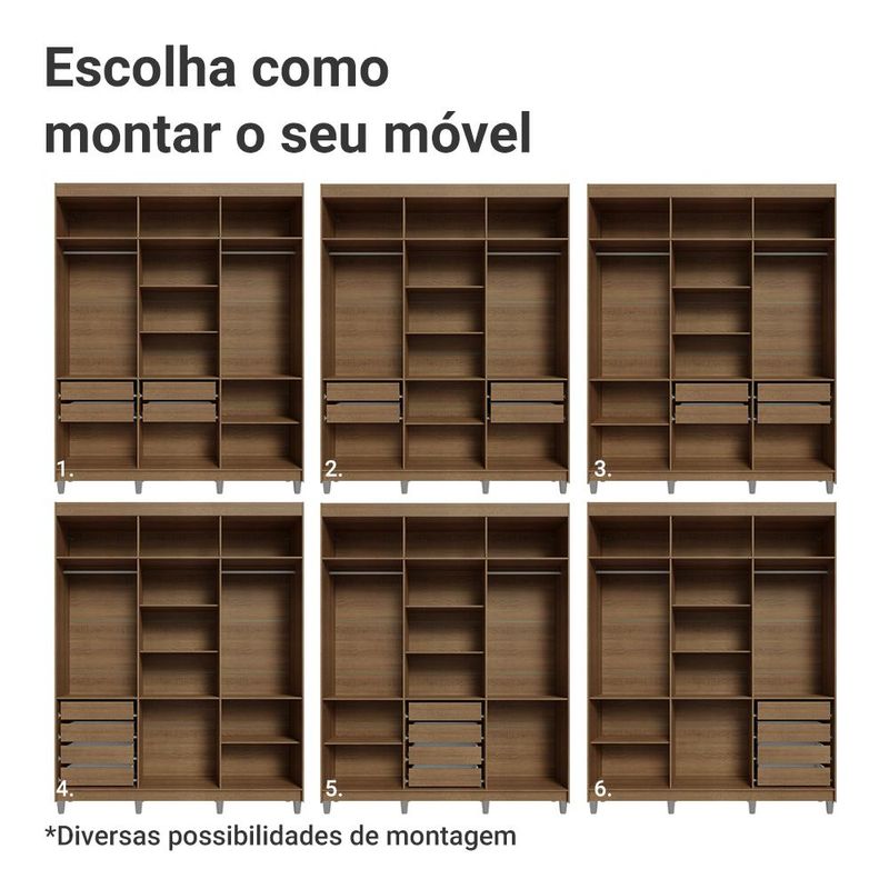 O Guarda-Roupa Saturno oferece versatilidade para organizar seu espaço da melhor forma. Com dobradiças com amortecimento, as portas fecham suavemente. As gavetas permitem abertura total, enquanto o amplo maleiro é perfeito para itens maiores. Além disso, você pode ajustar as gavetas e prateleiras para personalizar o interior conforme suas necessidades.