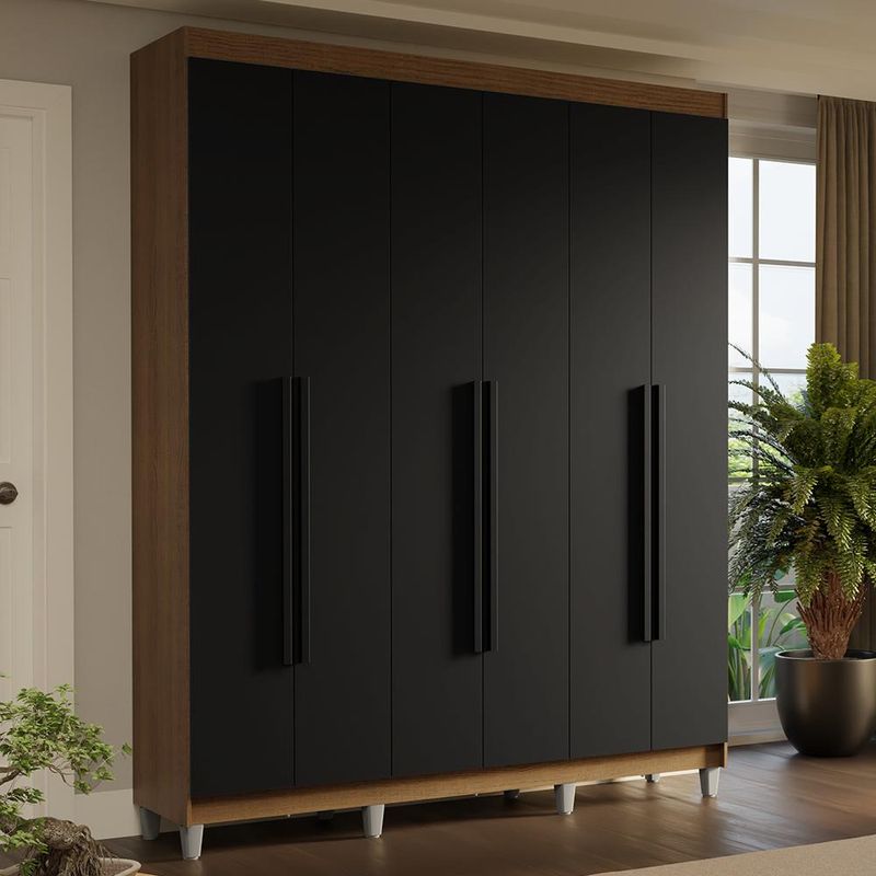 Com acabamento de alta resistência, o Guarda-Roupa Saturno garante durabilidade por muito mais tempo. A estrutura é em tom amadeirado Rustic e as portas e puxadores em preto, criando um visual sofisticado, que se adapta a qualquer estilo de decoração. Os puxadores de 80 cm, fabricados em MDF, são um dos grandes diferenciais, trazendo um design alongado e moderno. Os pés elevam o móvel, adicionando elegância e facilitando a limpeza.