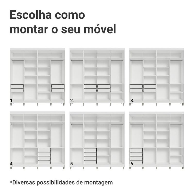 Com amplo espaço para organizar roupas, calçados e acessórios, conta com portas de fechamento suave graças às dobradiças com amortecimento. As gavetas possuem corrediças que permitem abertura total, e o maleiro espaçoso é ideal para itens maiores. Você ainda pode ajustar gavetas e prateleiras para personalizar o interior conforme suas necessidades.