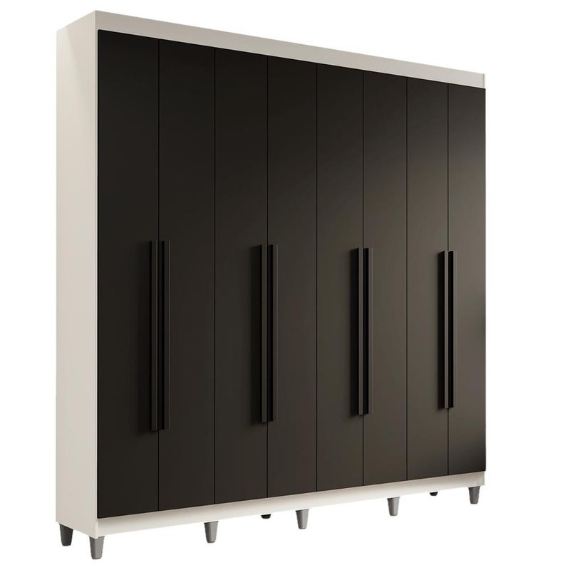 O acabamento de alta resistência é em Branco e as portas e os puxadores pretos criam um visual elegante e moderno. Os puxadores de 80 cm em MDF destacam o design alongado do móvel, e os pés elevam o guarda-roupa, facilitando a limpeza e valorizando o ambiente.