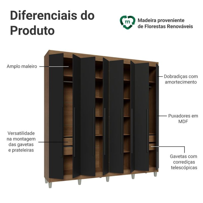 Com amplo espaço para organizar roupas, calçados e acessórios, ele conta com portas de fechamento suave graças às dobradiças com amortecimento. As gavetas possuem corrediças que permitem abertura total, e o maleiro espaçoso é ideal para itens maiores. Você ainda pode ajustar gavetas e prateleiras para personalizar o interior conforme suas necessidades.