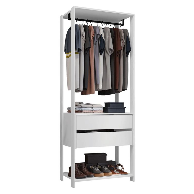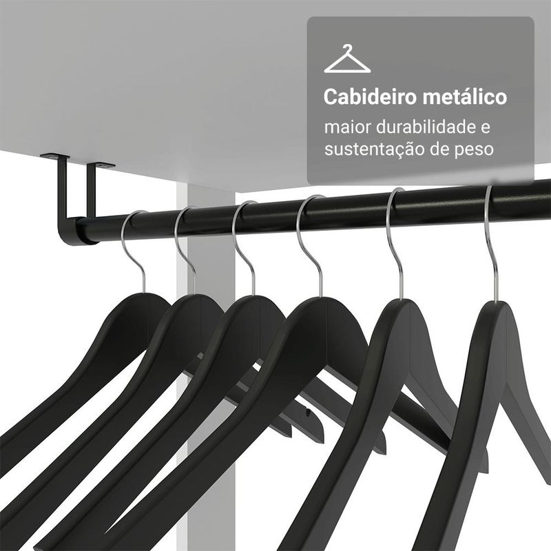 O Closet conta duas gavetas com corrediças que permitem abertura total e um cabideiro metálico para manter tudo no lugar, com visibilidade e funcionalidade. Além disso, o móvel conta com acabamento branco de alta resistência, pés com sapatas plásticas que protegem contra a umidade e ferragens incluídas para a fição na parede, garantindo mais estabilidade e segurança.