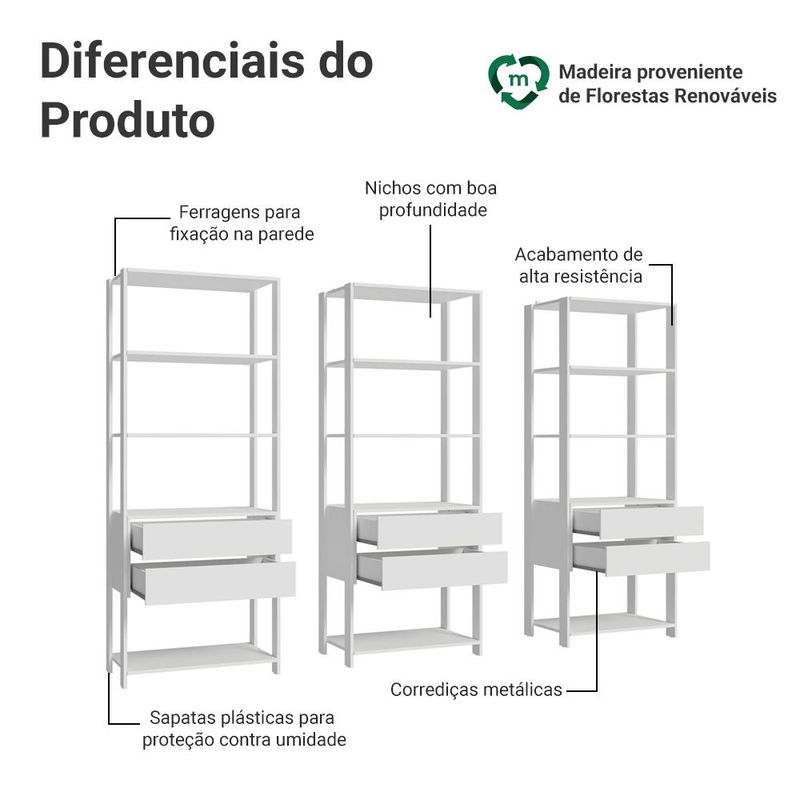 Além disso, o móvel conta com acabamento branco de alta resistência, pés com sapatas plásticas que protegem contra a umidade e ferragens incluídas para a fição na parede, garantindo mais estabilidade e segurança.
