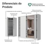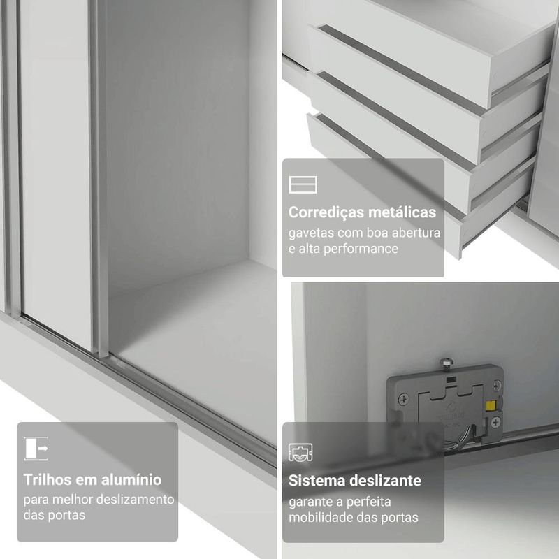 O Guarda-Roupa Royale, por sua vez, é fabricado em 100% em MDF, conta com três portas de correr, sendo uma com espelho que amplia o ambiente e otimiza o espaço. Seu interior é amplo e bem distribuído, com prateleiras, nichos, três cabideiros e quatro gavetas espaçosas, oferecendo capacidade para roupas, acessórios e muito mais.