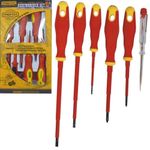 O Conjunto de Chaves de Fenda Isoladas é projetado para proporcionar segurança e precisão em trabalhos elétricos. Com 6 peças VDE, este conjunto oferece proteção confiável contra choques elétricos, sendo uma ferramenta essencial para eletricistas e profissionais da área. Para melhor conservação, recomenda-se limpeza com pano macio levemente umedecido, evitar abrasivos e armazenar em local seco e arejado, protegido de calor excessivo. Impactos e condições extremas podem comprometer o desempenho.
