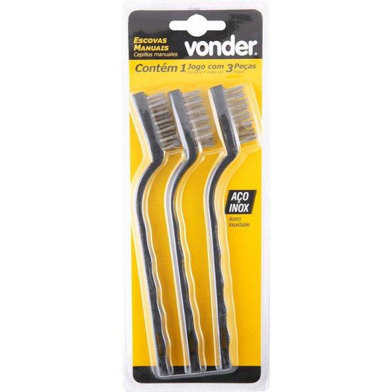 Marca: VonderConteúdo da Embalagem:1 Jogo com 3 escovas manuais iguais, de aço inox com cabo de 175 mm de comprimentoDestaques e diferenciais:Possui facilidade de limpeza em locais de difícil acessoAplicações e dicas de uso:Indicado para limpeza de peças em geralCaracterísticas Técnicas:Número de peças do jogo para limpeza: 3 peças