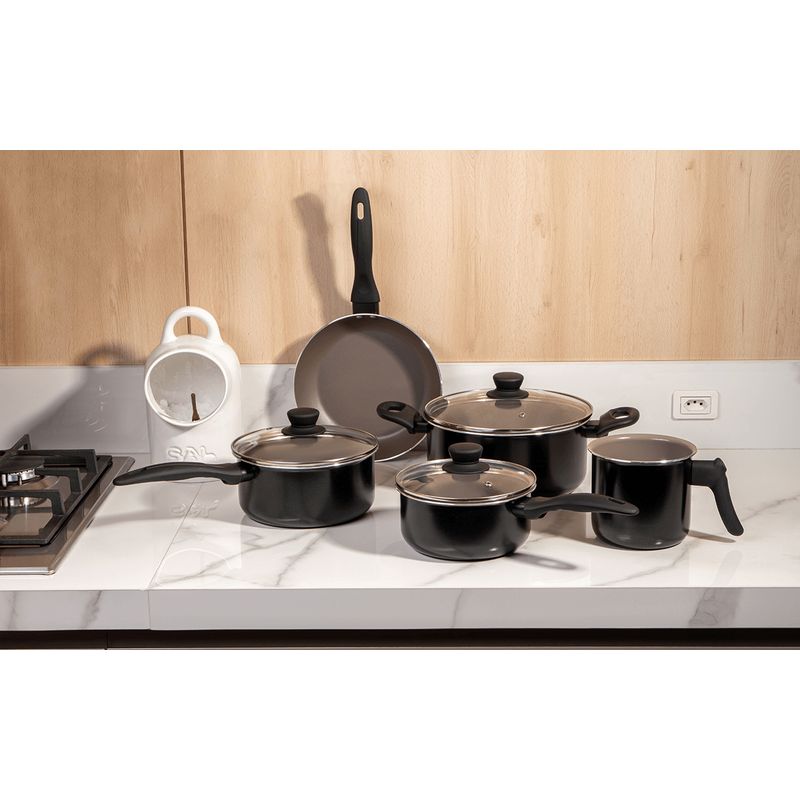 O Jogo de Panelas Brinox Antiaderente Ceramic Life 5 Peças Easy Preto é composto por:
