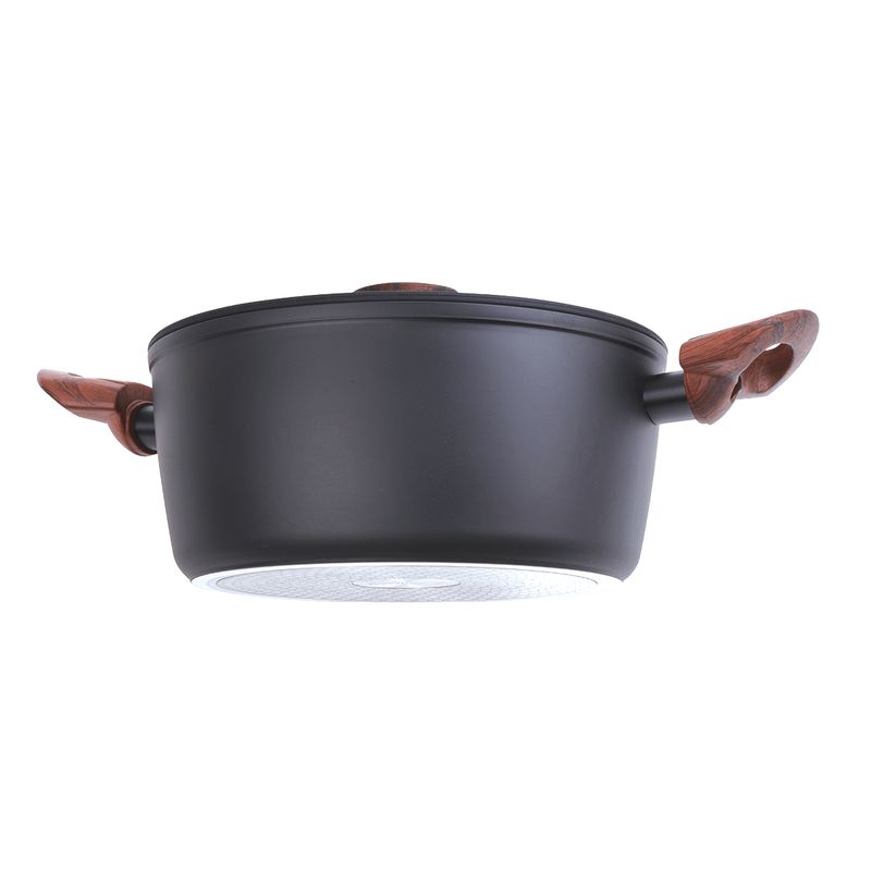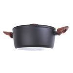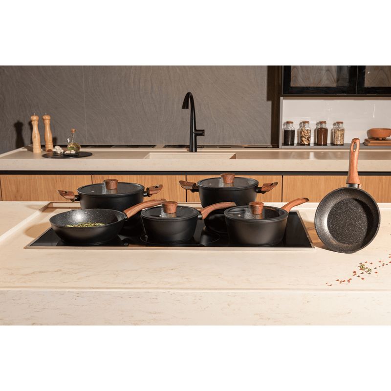 As alças e cabos, com acabamento amadeirado e toque soft-touch, possuem tecnologia antitérmica, evitando o aquecimento excessivo e proporcionando mais segurança durante o manuseio. Além disso, o acabamento externo preto fosco e o interior marmorizado conferem um visual sofisticado e moderno ao conjunto, que se adapta perfeitamente a qualquer estilo de cozinha.