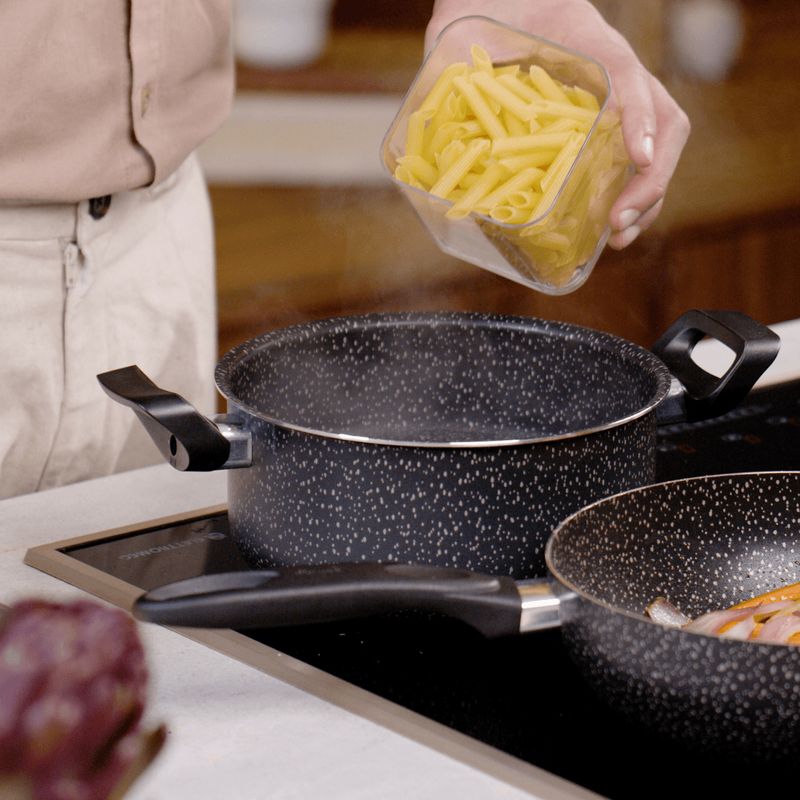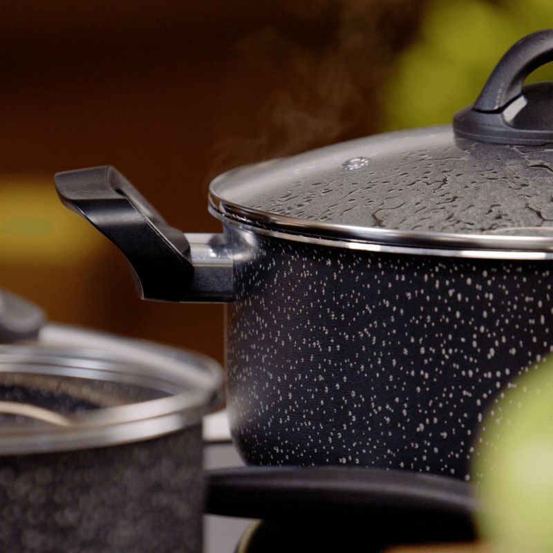 Características técnicas:Material: Alumínio com revestimento interno antiaderente com partículas de cerâmicaCor: PretaCabos: Baquelite antitérmicoTampas: Vidro temperado com saída de vaporIndicado para: Fogões a gás, elétrico e vitrocerâmico