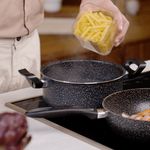 Detalhes que fazem a diferença!Revestimento antiaderente com partículas de cerâmica: Cozimento mais saudável, menos óleo e alimentos que não grudam, além de facilitar a limpeza.Cabos em baquelite: Material resistente ao calor que não esquenta durante o uso, proporcionando mais segurança no manuseio.Estrutura robusta em alumínio: Garante distribuição uniforme do calor e cozimento rápido.Tampas de vidro temperado com saída de vapor: Mais controle e praticidade no preparo das receitas.