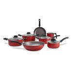 Com estrutura em alumínio que cozinha por igual e mais rápido, tampas de vidro temperado, com saída para vapor e cabos e alças de baquelite que não esquentam, o Jogo de Panelas Brinox Antiaderente Pro-Flon 7 Peça Ruby Vermelho possui antiaderente pro-flon que não gruda, é fácil de limpar e livre de PFOA. Como todas as panelas da Brinox, a linha Ruby possui Classificação A no Inmetro. Disponível na cor preta, uma das cores mais versáteis e práticas para a cozinha, a linha Ruby é uma ótima opção para o dia a dia pois se encaixa bem tanto em ambientes sofisticados quanto nos mais mais simples. Esse conjunto é composto por: Caçarola com Tampa Ø 22 x 10 cm - 3,45 L, Caçarola com Tampa Ø 20 x 9 cm - 2,6 L, Panela com Tampa Ø 18 x 8 cm - 1,9 L, Panela com Tampa Ø 16 x 7 cm - 1,3 L, Wok Ø 26x8 cm - 3 L, Frigideira Ø 22 x 3,5 cm - 0,8 L, Fervedor Ø 12 x 11,5 cm.