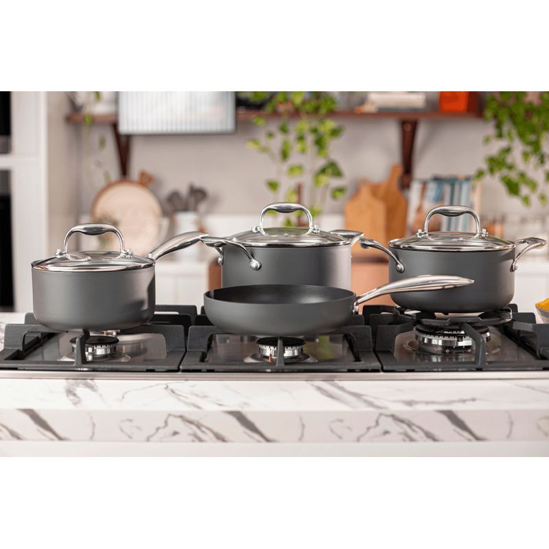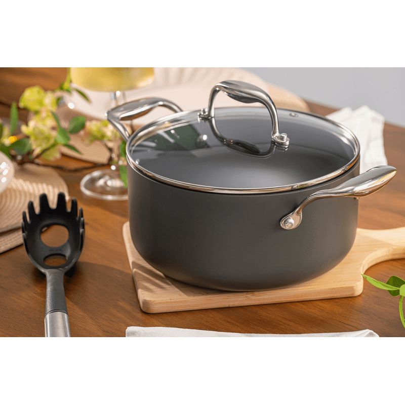 A cor Cinza deste conjunto traz elegância e requinte para a decoração. Cabos, alças e poméis são aço inoxidável rebitado, possibilitando o uso das panelas no forno, sem as tampas. As tampas em vidro temperado têm saída para o vapor e facilitam a visibilidade ao longo do processo de cocção.