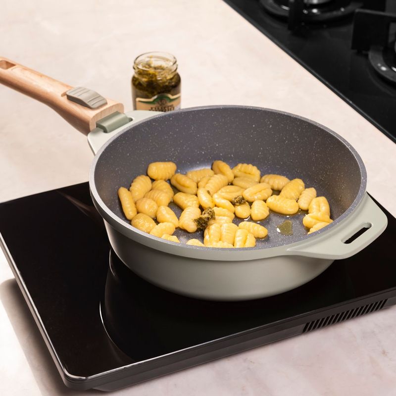 Com estrutura em alumínio de alta qualidade, as panelas aquecem de forma rápida e uniforme. A caçarola possui revestimento cerâmico Pro Ceramic Premium, enquanto as frigideiras são revestidas com Mineral Resist, ambos livres de PFOA e elementos tóxicos. Isso garante um cozimento mais saudável e limpeza muito mais fácil.