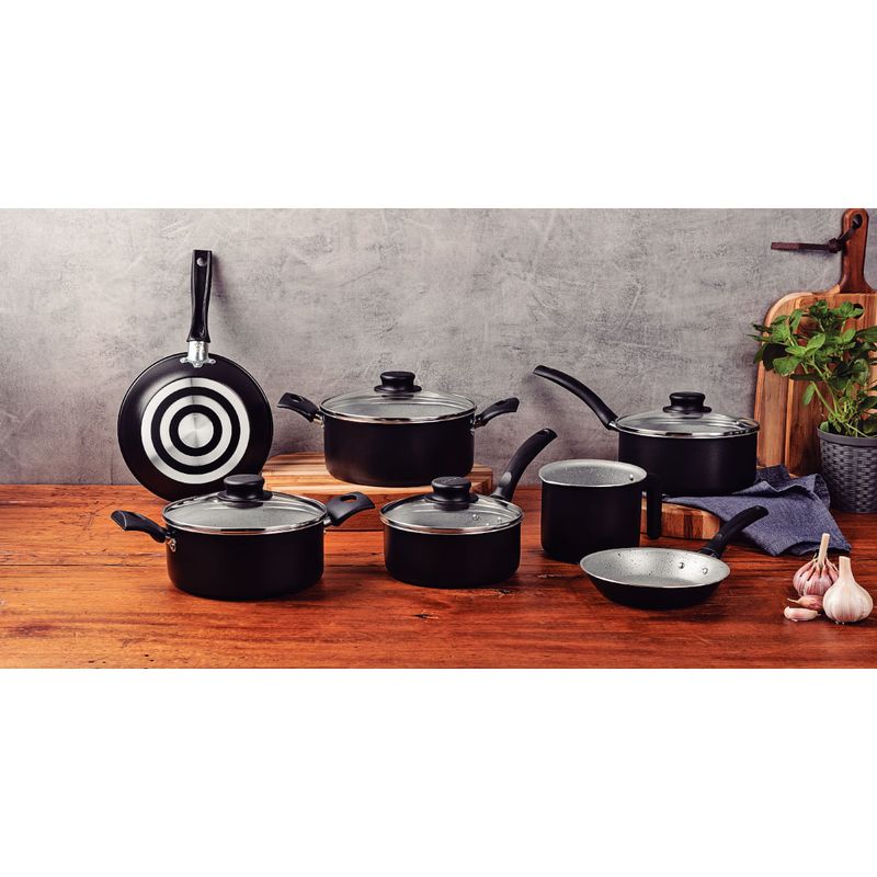 Quem não abre mão de alta qualidade na cozinha e deseja praticidade durante o preparo das suas refeições, precisa contar com o jogo de panelas Tramontina Turim em alumínio com revestimento interno e externo em antiaderente Starflon Max preto 07 peças. Composto por panelas, caçarolas, frigideiras e fervedor, ele é um jogo desenvolvido em alumínio com espessura especial e revestimento em antiaderente Starflon. Devido a essas características, as peças cozinham os alimentos de maneira rápida e uniforme, sem que eles grudem em sua superfície; garantindo também maior resistência, durabilidade e facilidade na limpeza. As panelas e caçarolas vem com tampas de vidro temperado com bordas de aço inox e pegadores de nylon e todos os itens contam com cabos ou alças em baquelite antitérmico, material que não aquece e proporciona um manuseio confortável e seguro. Além de todas essas características, as peças do jogo podem ser levadas à máquina de lavar louças e utilizadas em fogões a gás, elétricos e vitrocerâmicos - resistência elétrica. Escolha Tramontina e transforme seu dia a dia na cozinha!