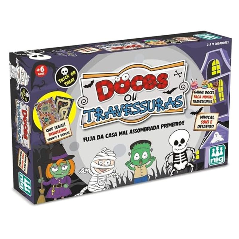 Um jogo super divertido da Nig no melhor estilo Halloween, este jogo vai desafiar as crianças a ganhar doces ou fazer travessuras percorrendo o tabuleiro que tem frente e verso!