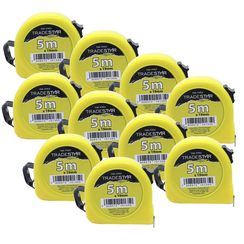 Trena de medição em aço pintado, com 5 metros de comprimento e 19 mm de largura.
