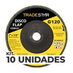 Kit C/ 10 Unidades Disco Flap Conico 7" 180mm Fds180-120fc Z120 Tradestar O Disco Flap Conico 7" 180mm Fds180-120fc Z120 Grão 120, a escolha definitiva para profissionais que buscam acabamentos superiores e eficiência nas suas tarefas. Com um formato cônico e um diâmetro de 180mm, este disco flap proporciona remoção de material precisa e acabamentos de alta qualidade em diversas superfícies.