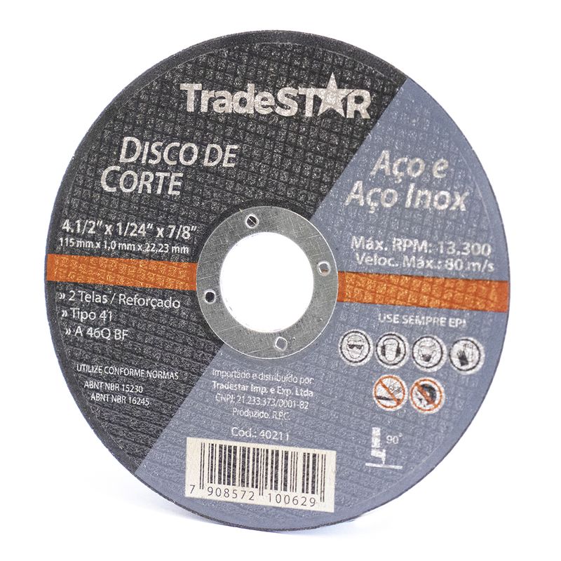R: Esta embalagem contém 10 discos de corte fino. Características: Indicação: Para corte de metais ferrosos e não ferrosos (inox, ferro, alumínio, aço, etc). Material: Óxido de alumínio aglomerado com resina. Formato: Disco de corte fino. Diâmetro Externo: 4.1/2" (115 mm). Espessura: 1,0 mm. Furo: 7/8" (22,23 mm). Marca: Tradestar. Conteúdo da Embalagem: 10 Discos de Corte Fino Inox 4.1/2 X 1,0 mm. Informações Adicionais: Pronta entrega – envio imediato! Emitimos nota fiscal em 100% de nossas vendas. Produto original, novo e com garantia contra defeito de fabricação. Garantia 90 dias após a compra. Observações: Imagens meramente ilustrativas. As tonalidades da cor do produto podem sofrer alterações de acordo com a tela que estiver usando para visualização. Vantagens de Comprar com a JJC Ferramentas: Experiência e Confiança: Somos especialistas em ferramentas e acessórios, garantindo produtos de qualidade e desempenho superior. Variedade e Qualidade: Oferecemos uma seleção abrangente de ferramentas, sempre priorizando a durabilidade e eficiência. Atendimento Personalizado: Nossa equipe está pronta para ajudá-lo, oferecendo suporte técnico e orientações precisas. Entrega Rápida: Garantimos uma logística eficiente, assegurando que seu pedido chegue no menor tempo possível. Satisfação Garantida: Se por algum motivo não ficar satisfeito, oferecemos política de devolução sem complicações.