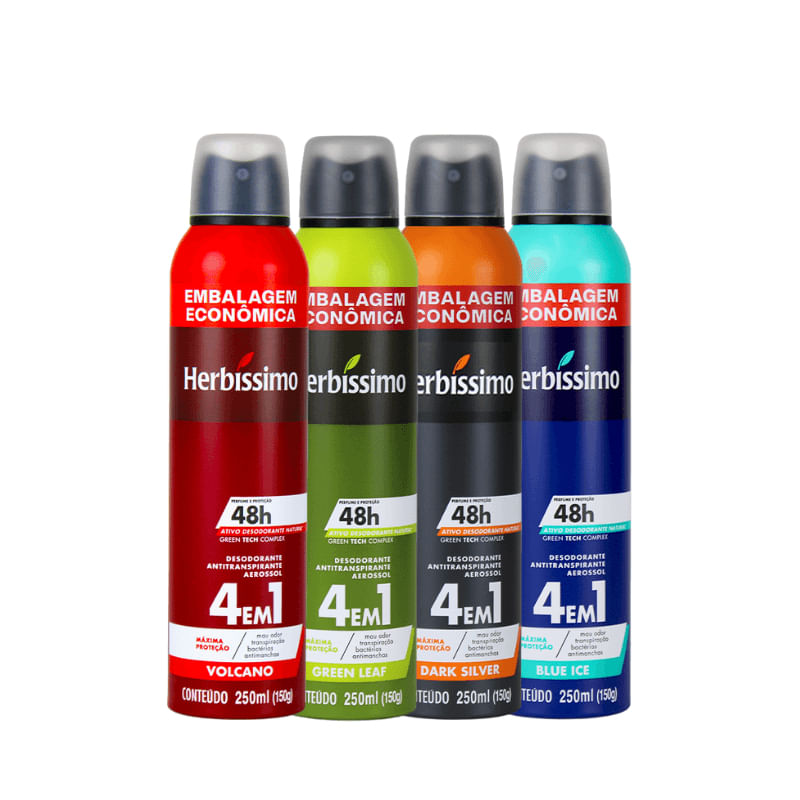 Kit Desodorante Aerosol Antitranspirante Herbíssimo proporciona agradável toque seco e proteção intensiva perfumada com 48 horas de proteção. Indicado para eliminar os odores desagradáveis produzidos pelo organismo e eliminados pela transpiração. 4 em 1: combate o mau odor, a transpiração/suor, elimina somente as bactérias ruins presentes nas axilas e sua composição evita manchas brancas e amareladas nas roupas. Sua fórmula garante até 48 horas de proteção desodorante e perfume, graças a uma tecnologia que libera de forma gradativa o composto natural.*Salix Alba (Willow) Bark Extract e *4-terpineol, que protege e cuida das axilas, tornando a pele mais saudável. O Green Tech Complex é um exclusive complexo ativo extraido da natureza, que promove proteção contínua e cuidado com a pele, eliminando apenas as bactérias causadoras do mau odor, de forma gradativa no momento em que você mais precisa. Importante: Inofensivo para camada de ozônio. Não contém CFC. Conteúdo: 150ml.