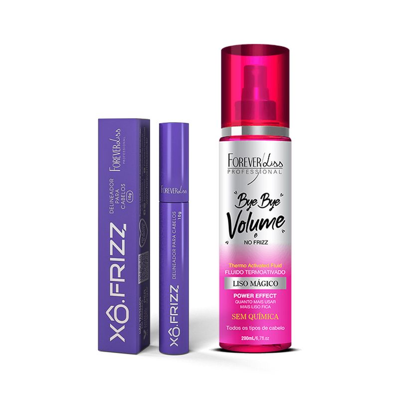 O Xô Frizz Modelador de Fios Forever Liss 10g reduz o frizz instantaneamente, alinha fios e baby hair com leveza, sem oleosidade ou rigidez. É incolor e tem longa duração. O Spray Bye Bye Volume e No Frizz Liso Mágico 200ml alinha, reduz volume e frizz, com proteção térmica e ação antiumidade.