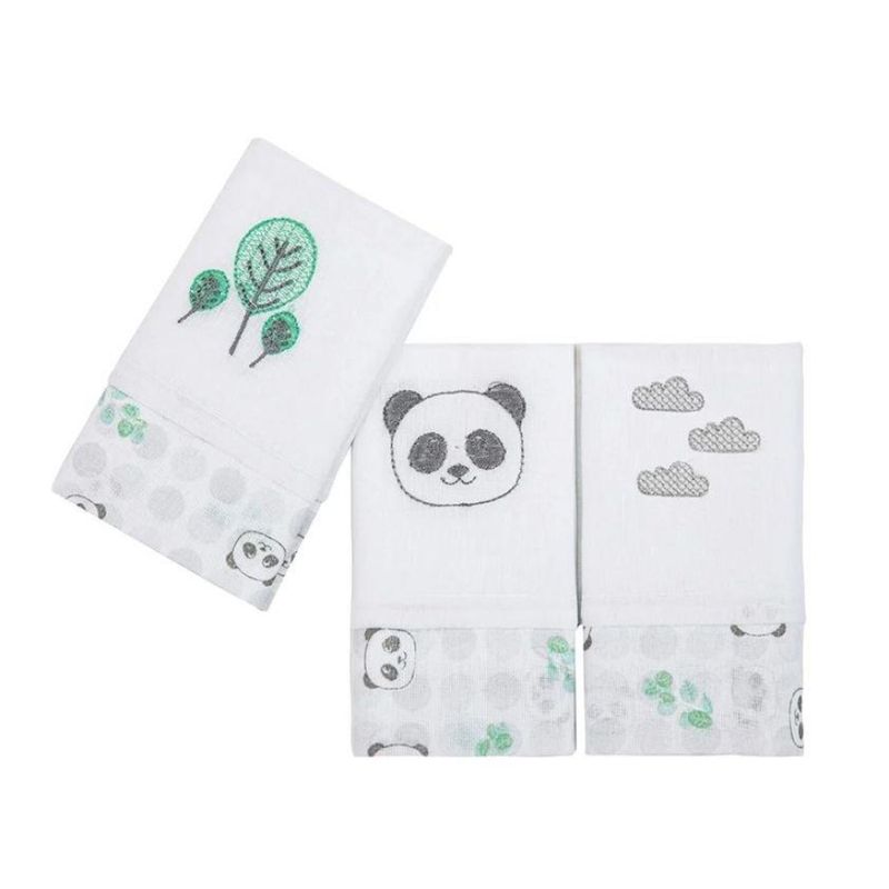 Kit Paninho De Boca Bordado Com 3 Pçs Panda Papi O Paninho de Boca é item indispensável do enxoval. É usado a todo momento, seja para limpar a boquinha, limpar a mãozinha, servir de paninho para a mamãe pôr no ombro na hora de arrotar, entre outras inúmeras utilizações. Seu tamanho de 40cm x 37cm é perfeito e ideal para levar em passeios com o bebê.