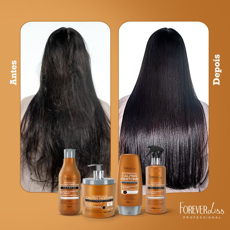 Modo de usoPenteia Cabelo:01. Com os fios úmidos, aplique o SPRAY PENTEIA CABELO no comprimento e ponta dos fios.02. Sem enxágue.03. Finalize como desejar.Pode ser usado tanto como protetor térmico como para desembaraçar os fios.Cauter Restore:01. Logo após lavar os cabelos com o Shampoo Forever Liss de sua preferência, tire o excesso de água dos fios para facilitar a penetração da Máscara Cauter Restore.02. Aplique a Máscara Cauter Restore nos fios ainda úmidos, espalhando por todo o comprimento.03. Enluve mecha a mecha.04. Deixar agir por 5 minutos.05. Enxágue até retirar o produto por completo.06. Utilize o condicionador Forever Liss de sua preferência para selar as cutículas.07. Finalize com secador e prancha para ativar os componentes do produto (temperatura abaixo de 200Cº).