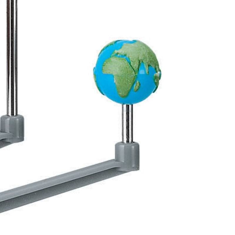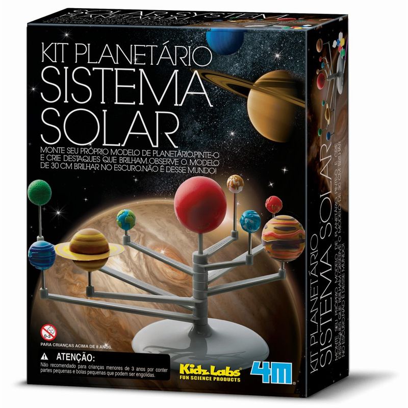 Conteúdo da embalagem: 1 conjunto composto por base e braços giratórios, 9 barras de aço, 1 pincel e potes de tinta, tinta com brilho, lixa, 1 modelo de anel de Saturno, instruções detalhadas de montagem e pintura com curiosidades.