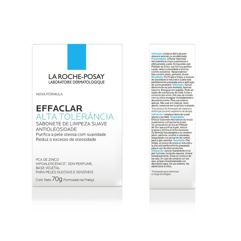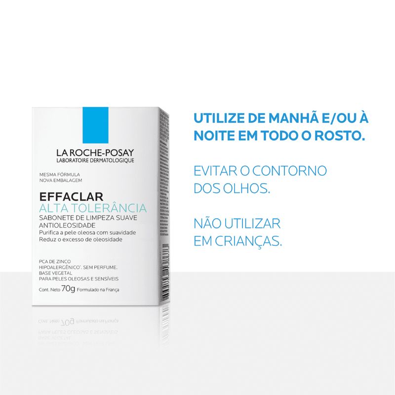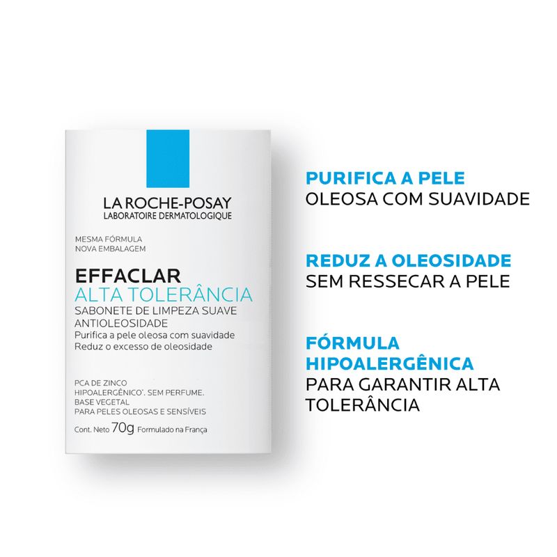 O Sabonete de Limpeza Facial Effaclar Alta Tolerância promove uma limpeza suave da pele oleosa, sensível ou sensibilizada, reduzindo a oleosidade e eliminando o brilho excessivo. Sua fórmula de alta tolerância garante eficácia com conforto e sem ressecar a pele.