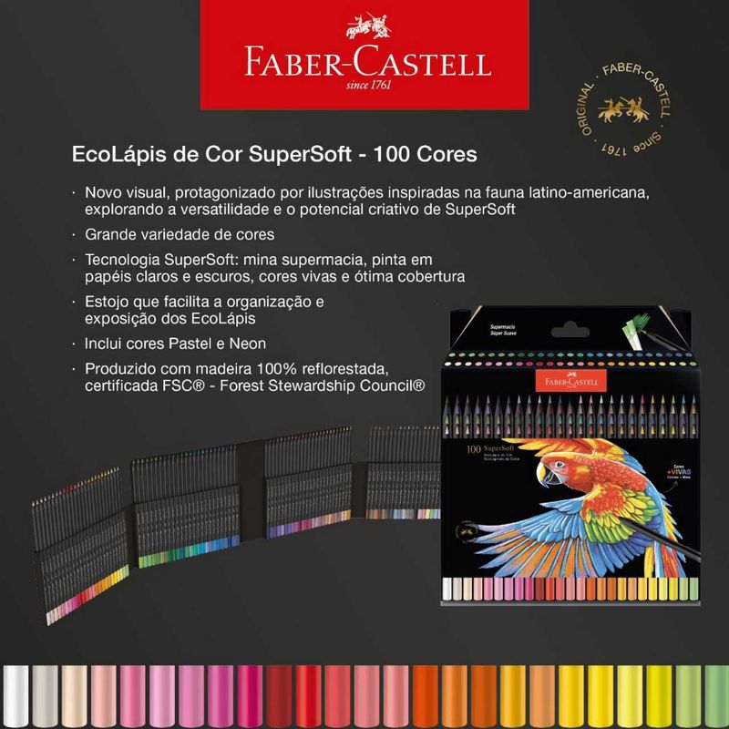 O Ecolápis de Cor Faber-Castell SuperSoft possui a exclusiva mina supermacia, que garante o máximo de conforto ao pintar. O estojo contém 50 cores mais vivas com excelente cobertura, sobre papéis claros e escuros. Além disso, a embalagem é reutilizável e 100% reciclável. Produzido com madeira 100% reflorestada e certificada pelo FSC: respeito ao meio ambiente. ATENÇÃO! Não recomendável para crianças de até 3 (três) anos, por conter parte(s) pequena(s) que pode(m) ser engolida(s) ou aspirada(s). Produto atóxico e não perecível. Características: - Cores incríveis e mais vibrantes - Mina supermacia com maior deposição de pigmento - Embalagem reutilizável e 100% reciclável - Excelente cobertura sobre papéis claros e escuros - Madeira 100% proveniente de manejo florestal sustentável e certificado pelo FSC: respeito ao meio ambiente - Produto atóxico e não perecível Especificações Marca: Faber-Castell Modelo: SuperSoft Código: 1207100SOFT Cores: 100 Cores Produto contém: Estojo com 100 Ecolápis de Cor