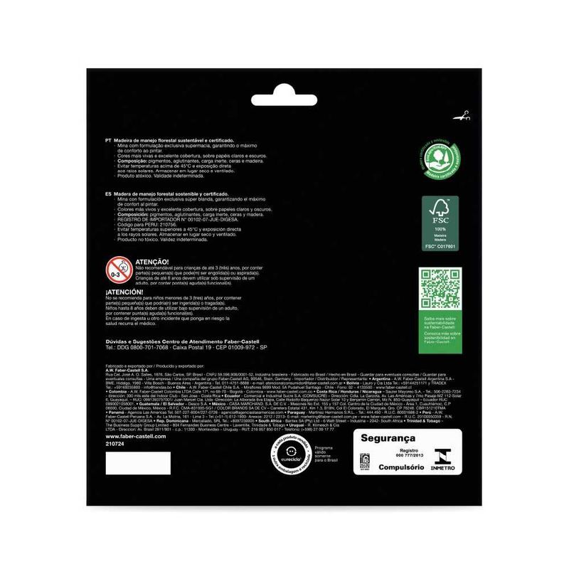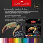 O Ecolápis de Cor Faber-Castell SuperSoft possui a exclusiva mina supermacia, que garante o máximo de conforto ao pintar. O estojo contém 24 cores mais vivas com excelente cobertura, sobre papéis claros e escuros. Além disso, a embalagem é reutilizável e 100% reciclável. Produzido com madeira 100% reflorestada e certificada pelo FSC: respeito ao meio ambiente. ATENÇÃO! Não recomendável para crianças de até 3 (três) anos, por conter parte(s) pequena(s) que pode(m) ser engolida(s) ou aspirada(s). Produto atóxico e não perecível. Este produto pode ser reciclado. Vamos limpar o planeta juntos.
